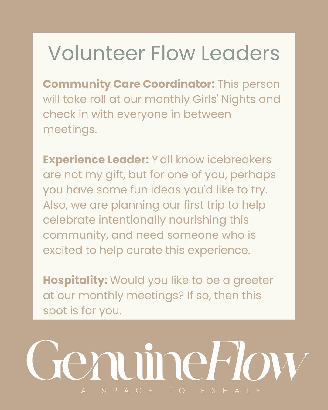 Hey girl, let’s nourish our community by expanding our reach. If you put on your vision board to step outside your comfort zone, then perhaps this is your opportunity. We are looking for volunteers to serve as flow leaders to help us intentionally nourish this community.