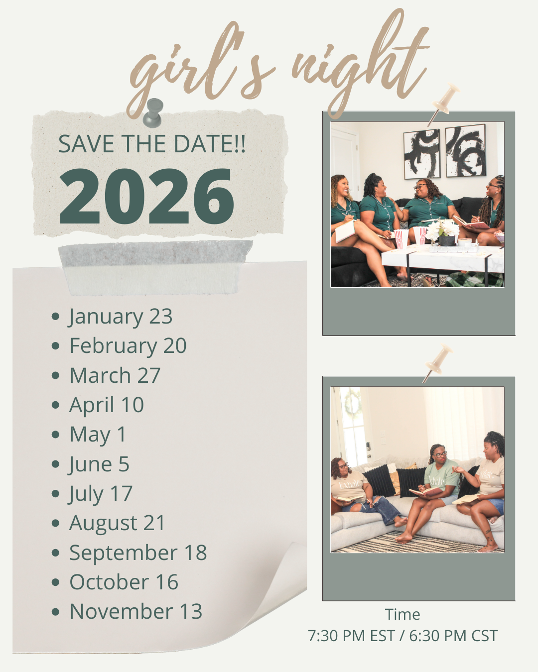 New things are on the horizon and I consider it a great joy and blessing to spend time with you each month at Girls’ Night. It is my heart that you grow in your walk with the Lord, learn the beauty of stilling yourself in His presence, and truly take a moment to exhale. Please join us and I can’t wait to kick it with you.